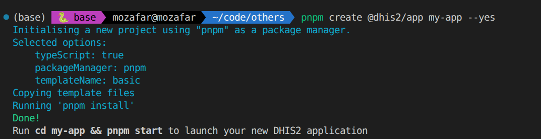 The --yes will create a new DHIS2 web application using the default options (pnpm as a package manager, and TypeScript for the language, using the default basic template).