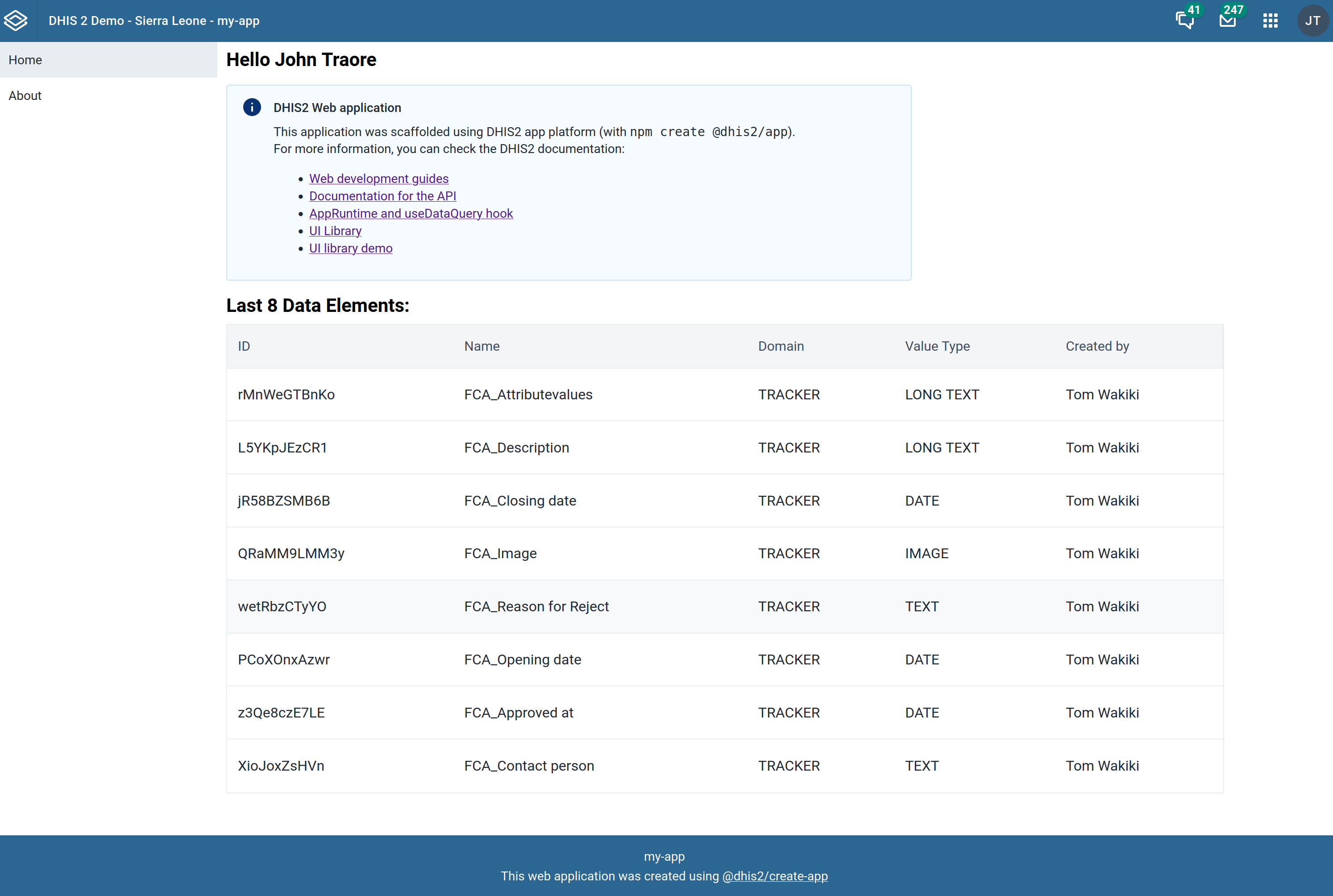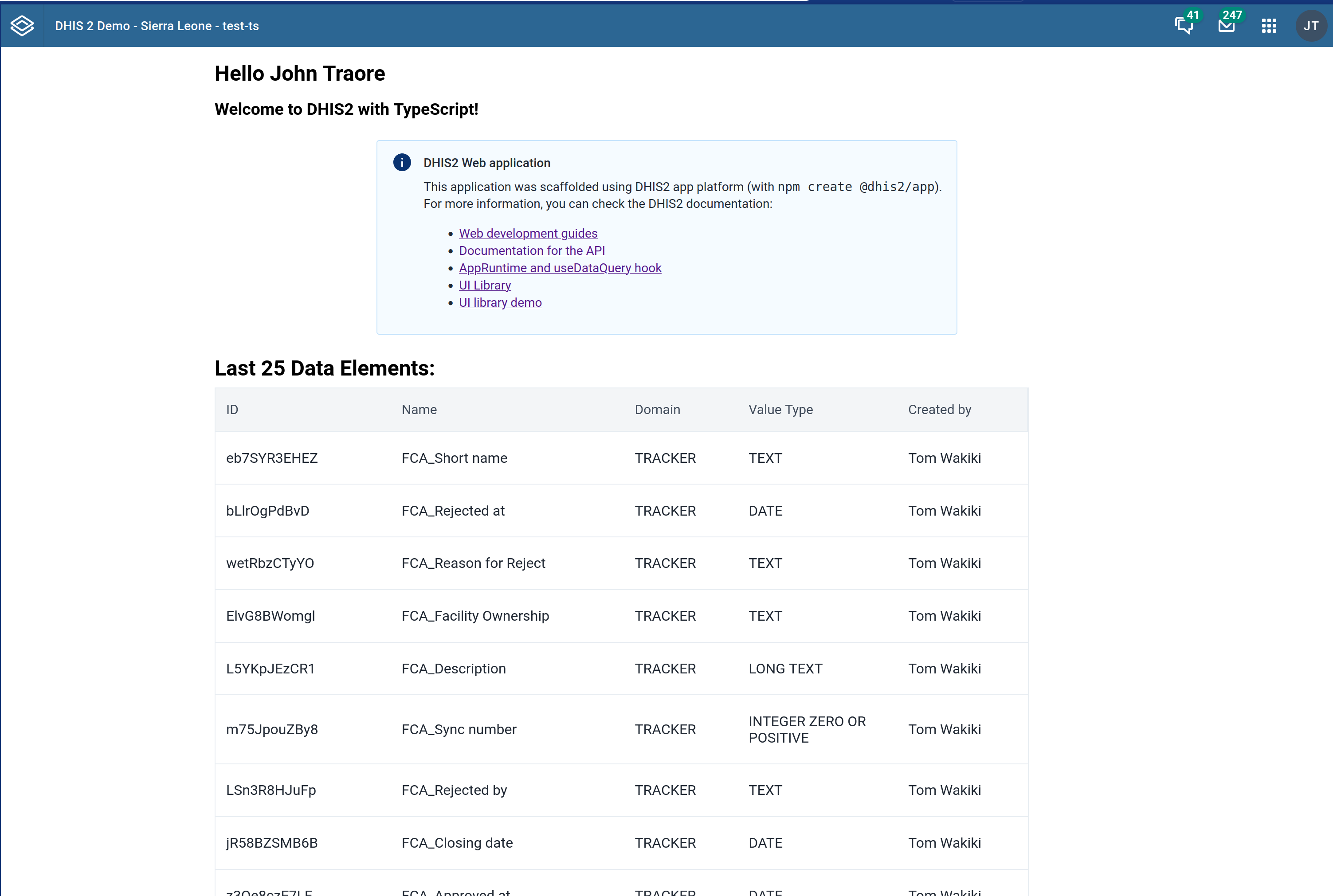 - You will see the default page with a welcome message to the currently logged-in user and a list of some metadata (data elements).